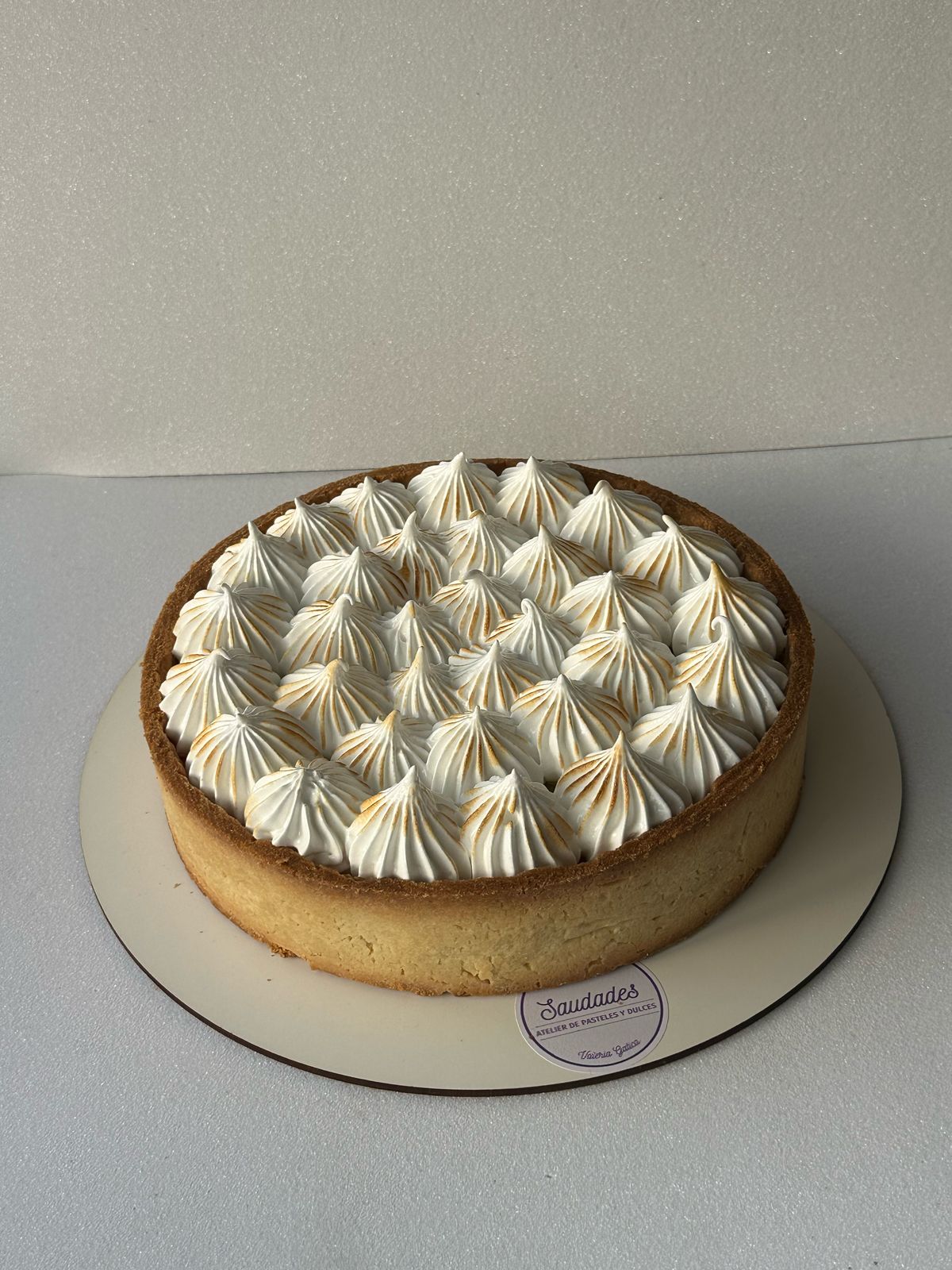 Pie de limón: base crocante, relleno de limón suave y merengue italiano dorado. Un clásico fresco y cremoso (~20 cm, 8–10 porciones). Saudades sigue siendo emoción y recuerdo; este pie es uno de los sabores más pedidos del atelier.